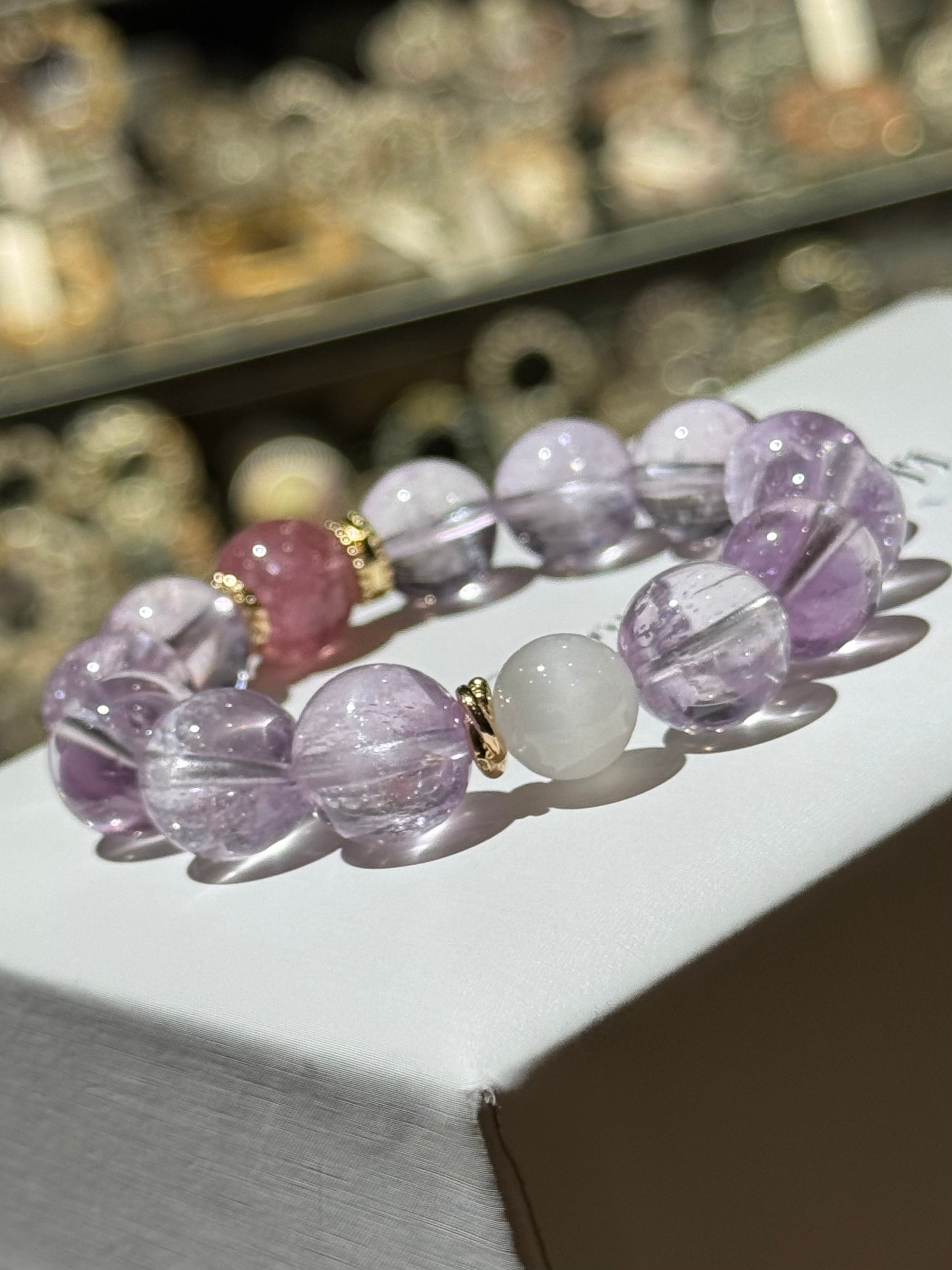 幻想的キャッツなホワイトサゲニティックインクォーツにトキメクピンクトルマリンが美しい宝石質なクンツァイトのブレスです♡