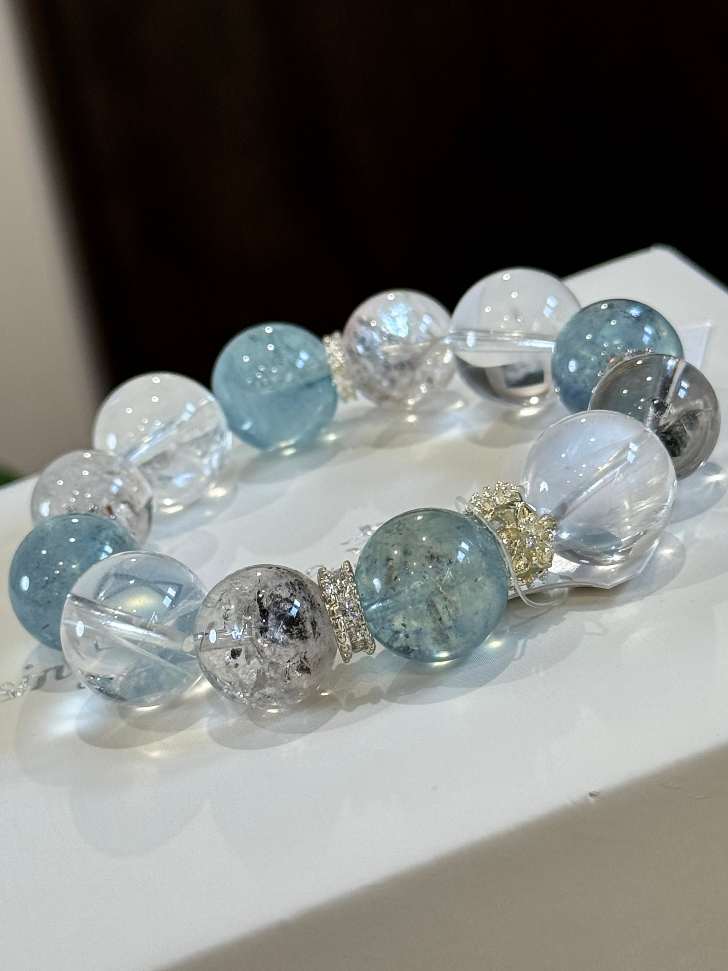 モスアクアマリン、シルバーエレスチャル、リチアマイカインクォーツがひんやりと輝く、雪の世界を閉じ込めたようなブレスです♡