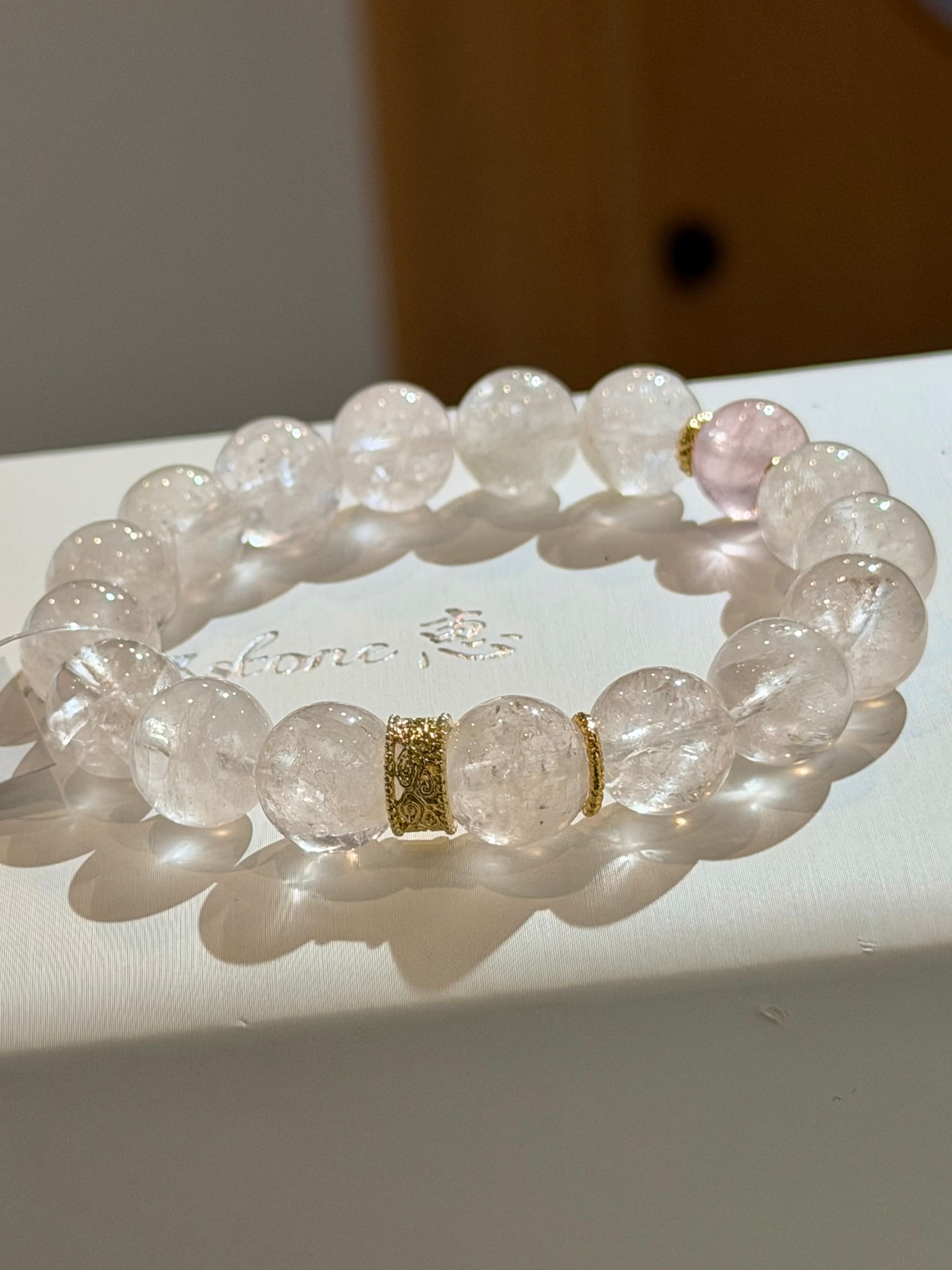 シンプルながらもキャッツアイ効果の出る粒と透き通ったモルガナイトが華やかなほんのりピンクが可愛いダンビュライトのブレスです♡