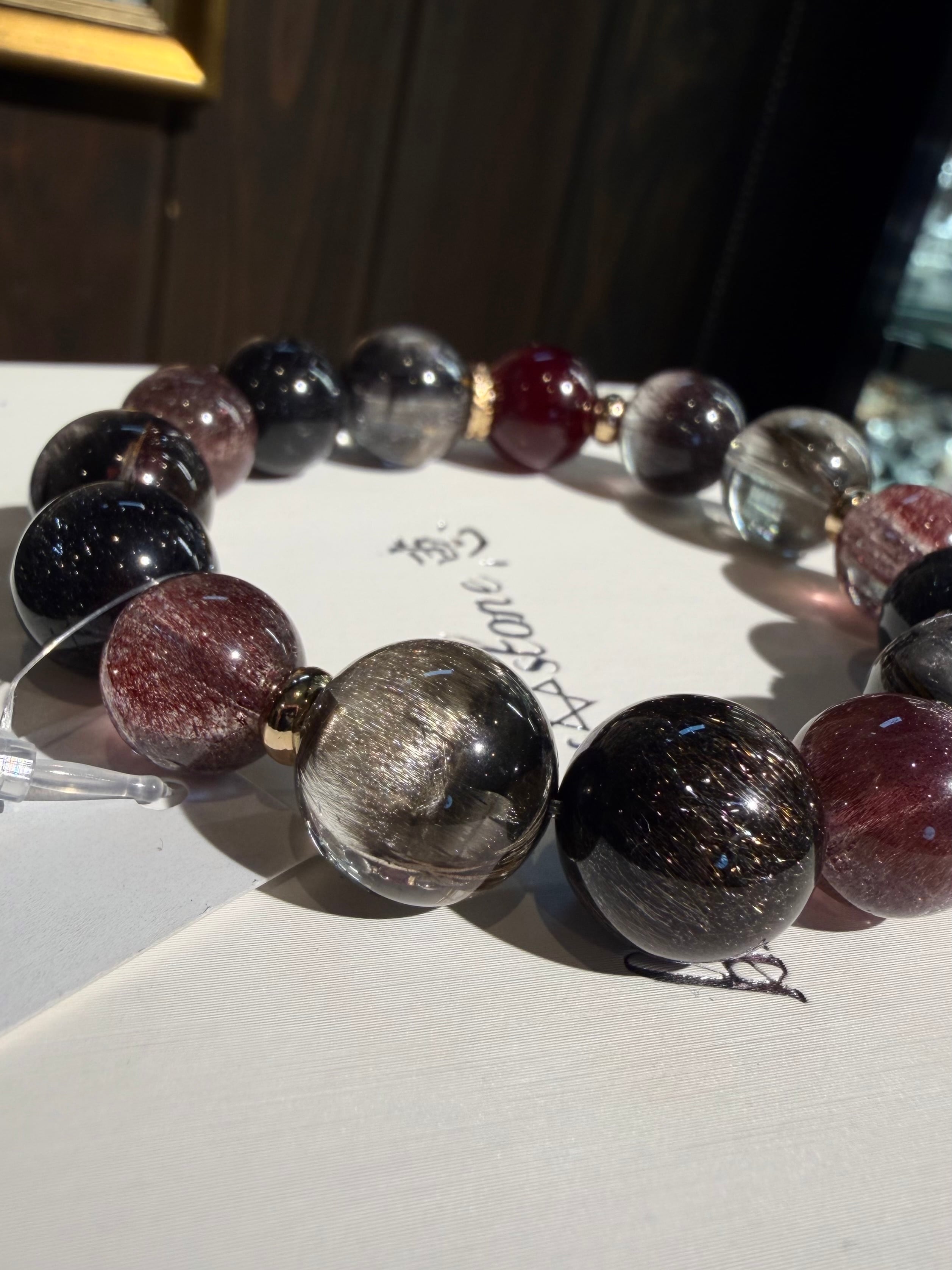 うっとりしてしまうピンクファイアがみられるスーパーセブン、プラチナルチル、ブラックブラウンルチル、ルべライトトルマリン、ブラックスーパーセブンの極上のがブレスです♡