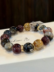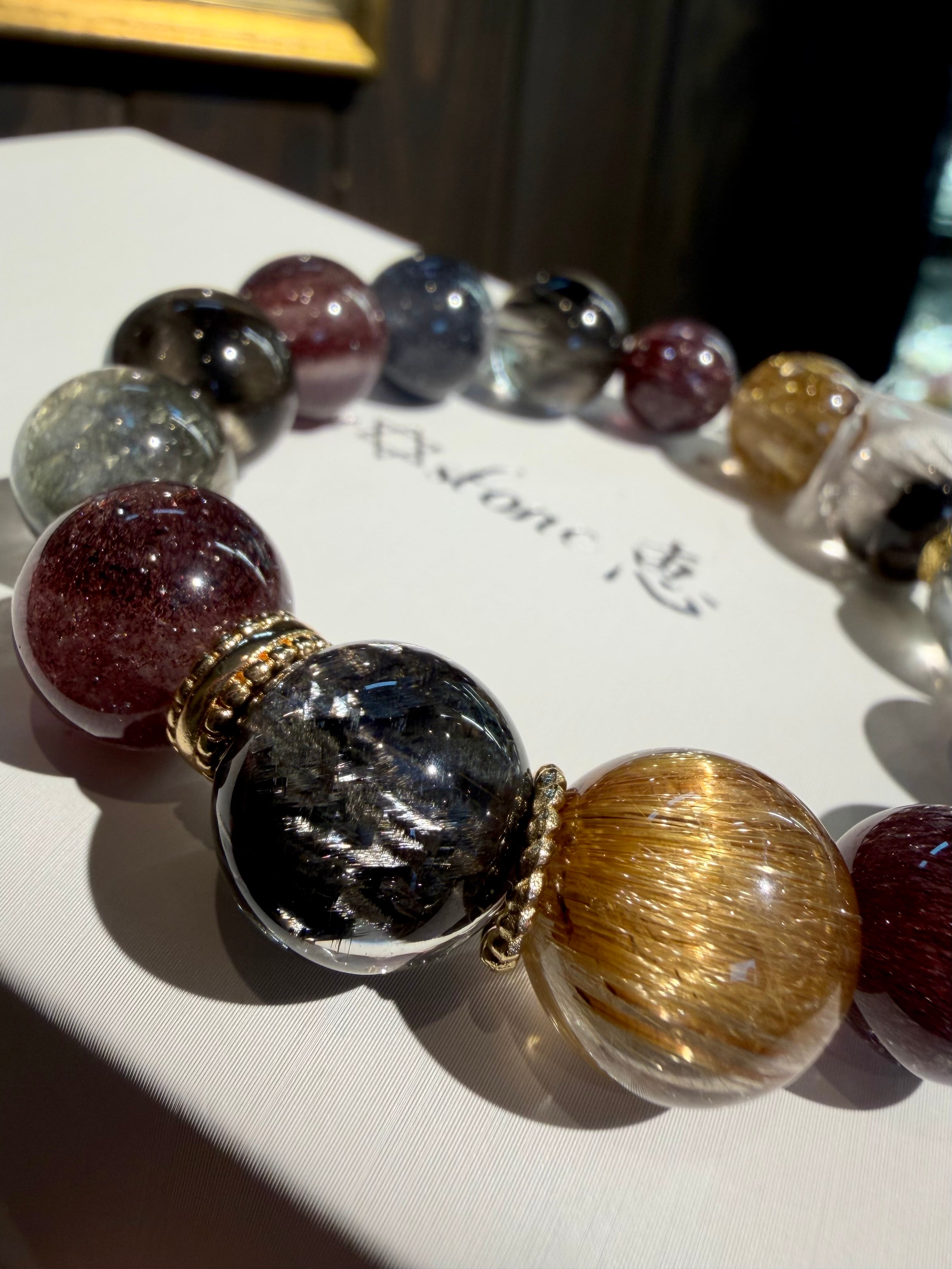 ピンクファイアがみられるスーパーセブン、タイチンルチル、アイアンコンクリュージョンクォーツ、ルチル、プラチナルチル、マーカサイトインクォーツ、ヘイロフスキー鉱の高貴な煌めきがたまらないブレスです♡
