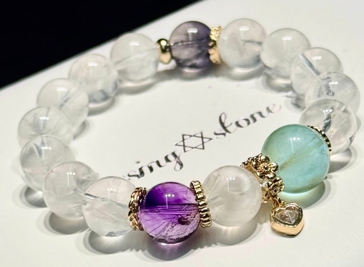 トラピッチェ模様が見られる天使のようなサゲニティックインクォーツに、パライバカラーのアクアマリンとアメジストエレスチャル、カラーチェンジアイオライトを合わせて、仕上げに愛をそえた可愛らしいブレスです♡