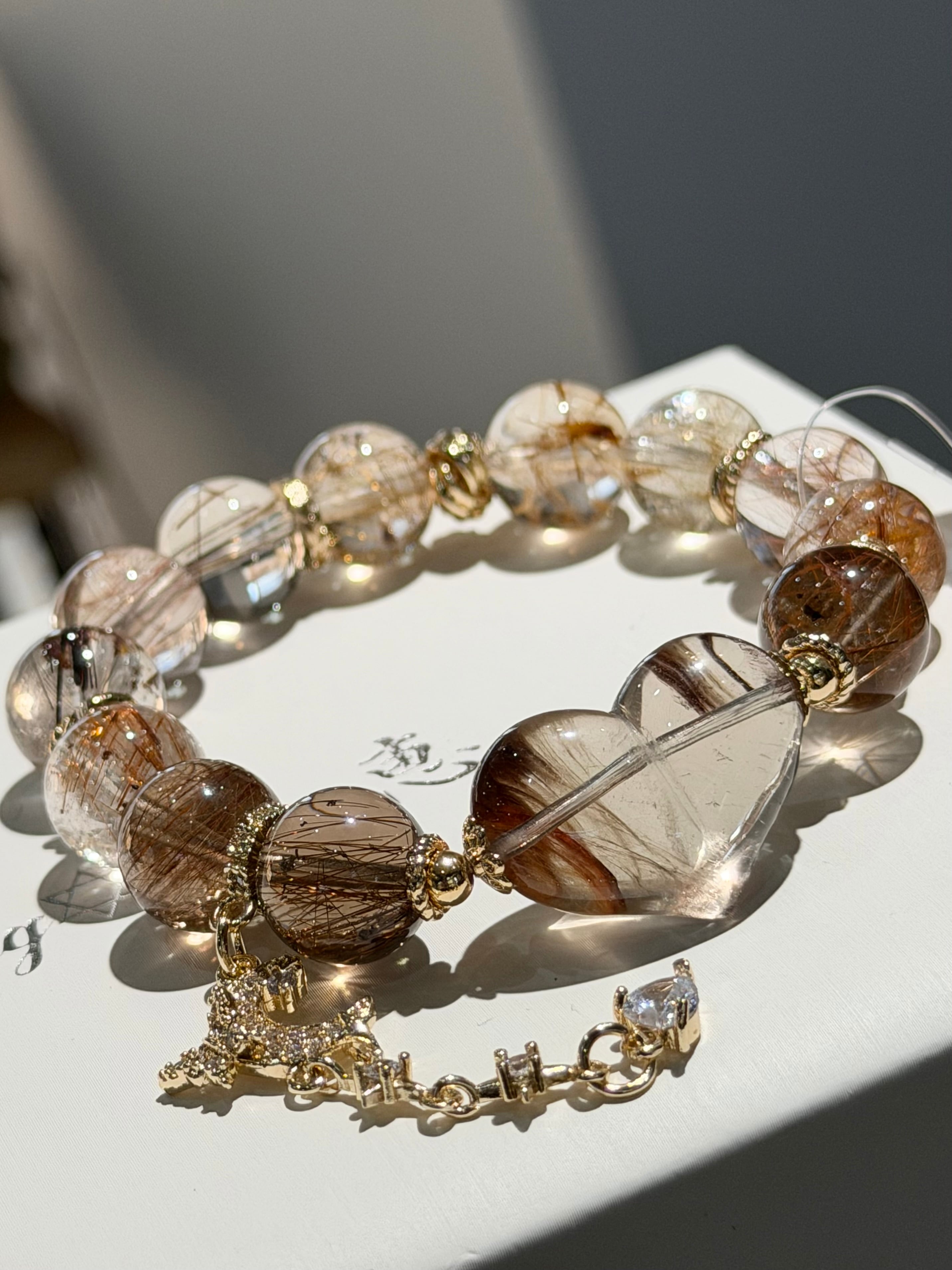 ハート型にチョコレートカラーの内包が可愛いサゲニテイックインクォーツとMIXルチルクォーツのブレスです♡