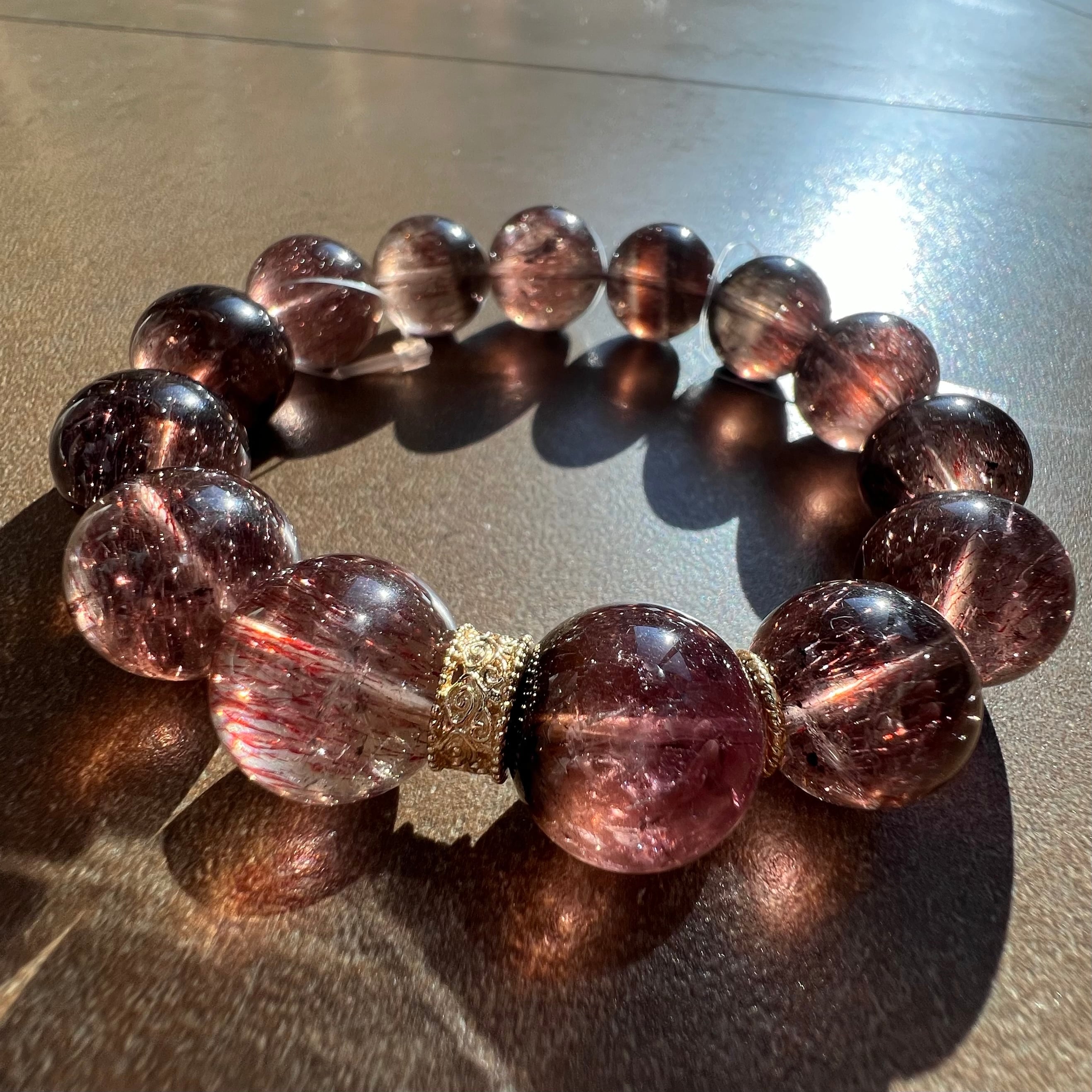 赤ピンクにキラキラ輝くトルマリンとスモーキースーパーセブンのブレスです♡