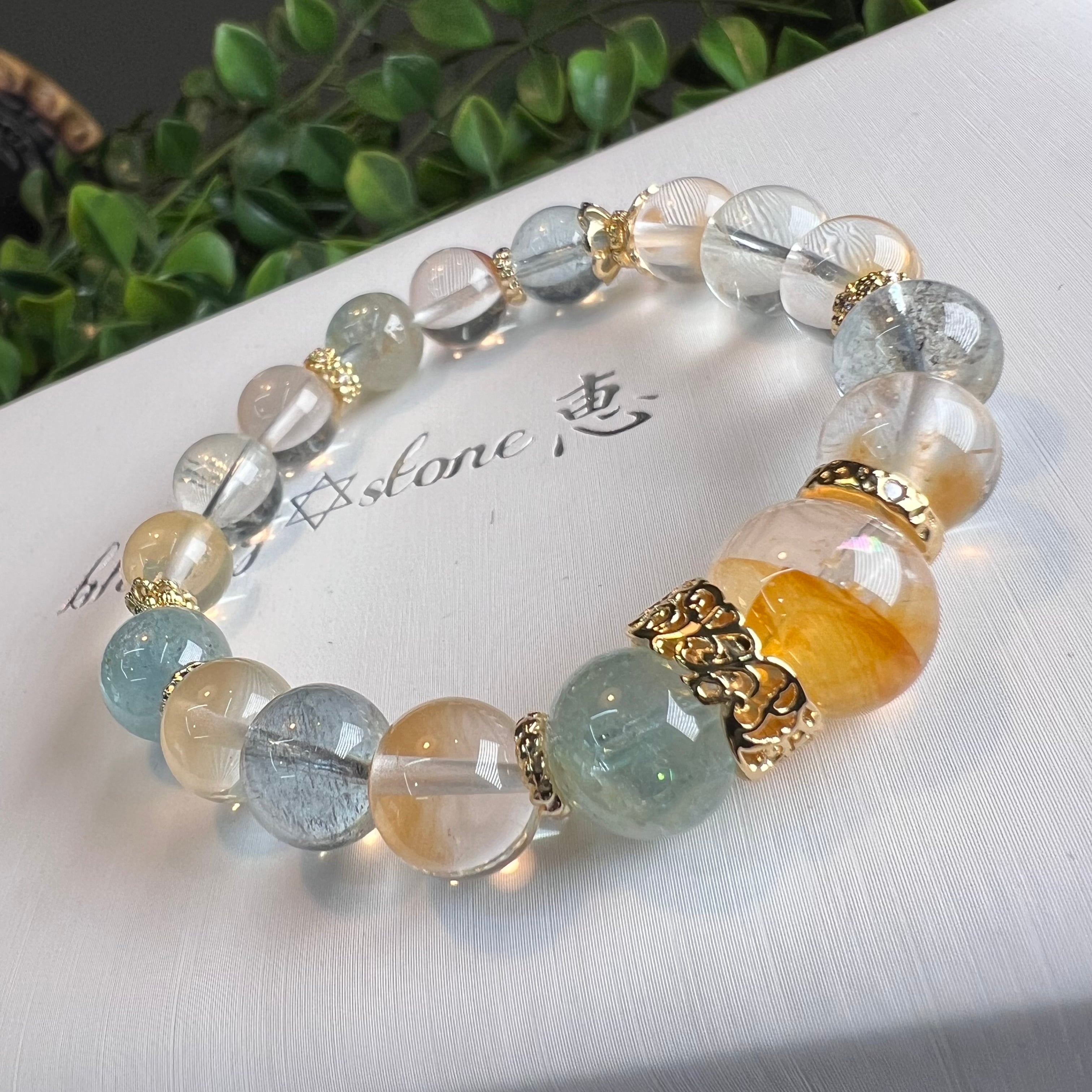 晴れ渡る空のようなブルーグリーントパーズとモスアクアマリン、向日葵のようなリモナイトとアンフィボールが可愛いブレスです♡