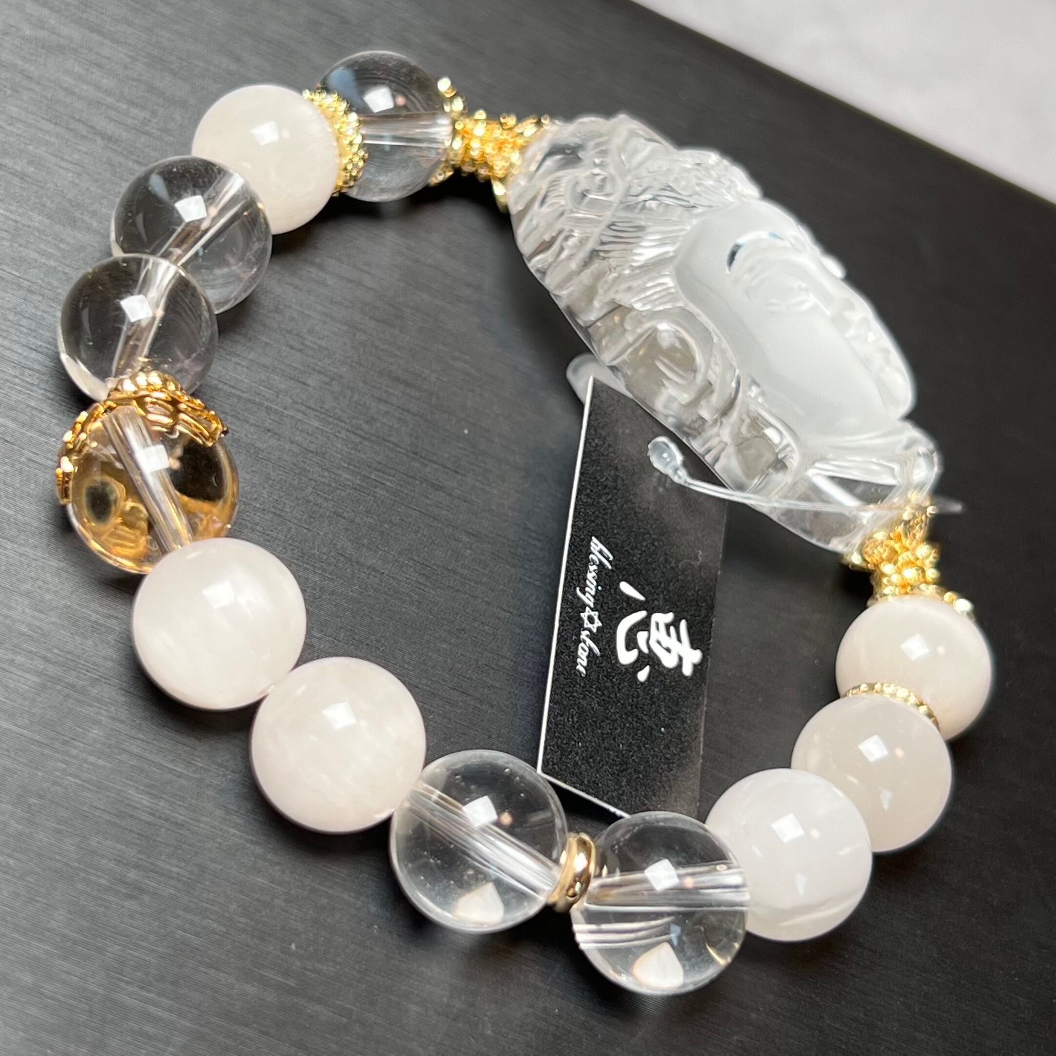 bleessingstone恵名物、とってもクリアな水晶(ブラジル産)とサゲニティックインクォーツが癒しのお釈迦様ブレスです♡