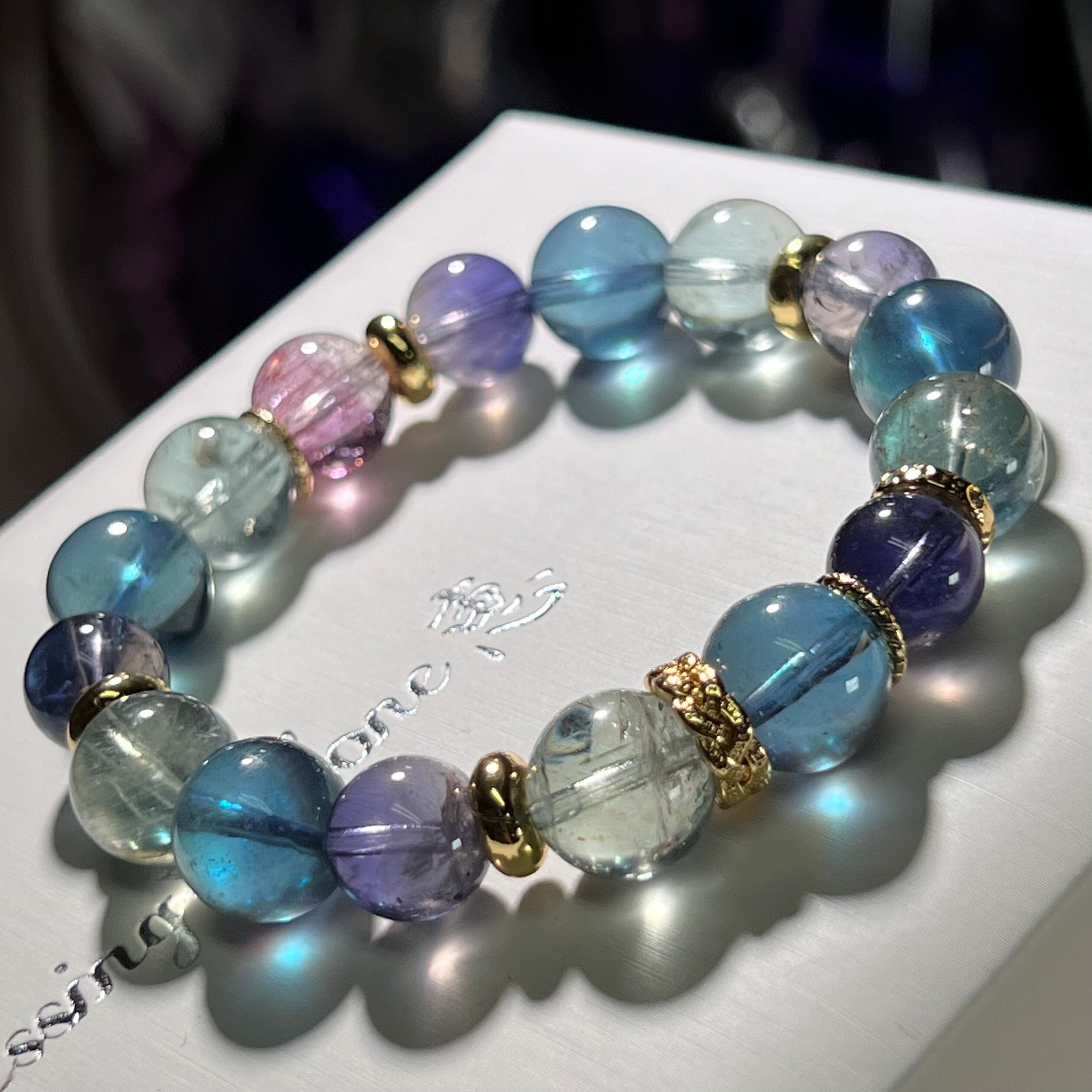 ブルーグリーンアクアマリン、カラーチェンジアイオライト、アルーシャサンストーン、アメジストエレスチャルがほんのり涼しげでアラビアンカラーなブレスです♡