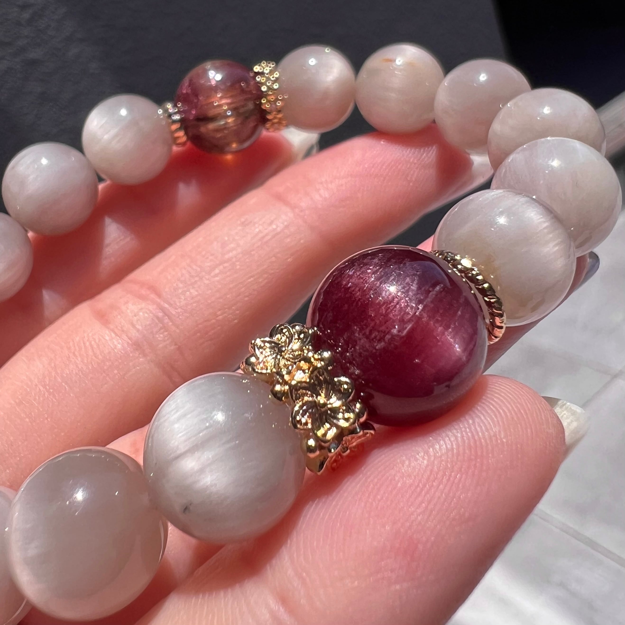 キャッツアイが美しいルベライトトルマリンと、キャッツアイグレージュサゲニティックインクォーツが美しすぎるブレスです♡