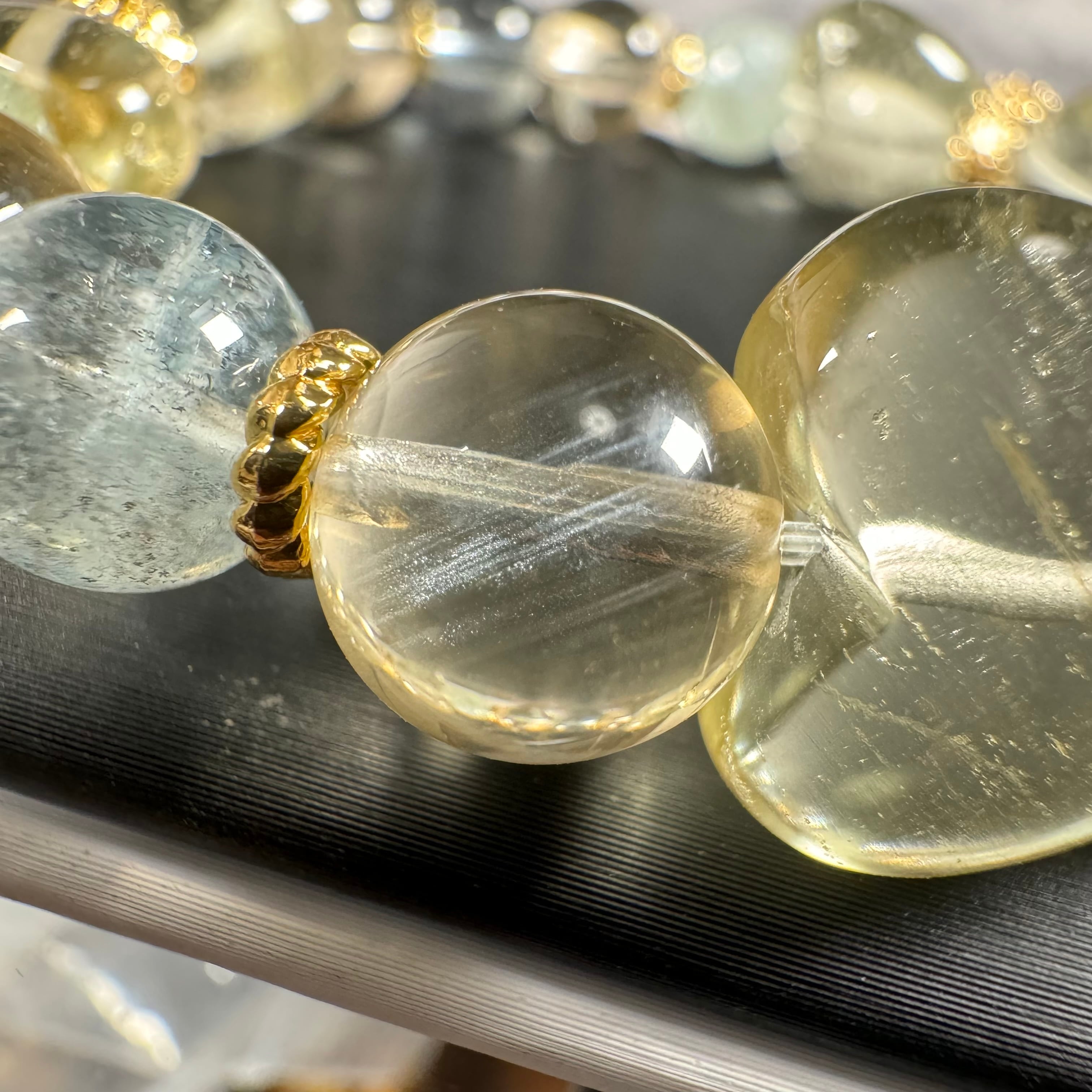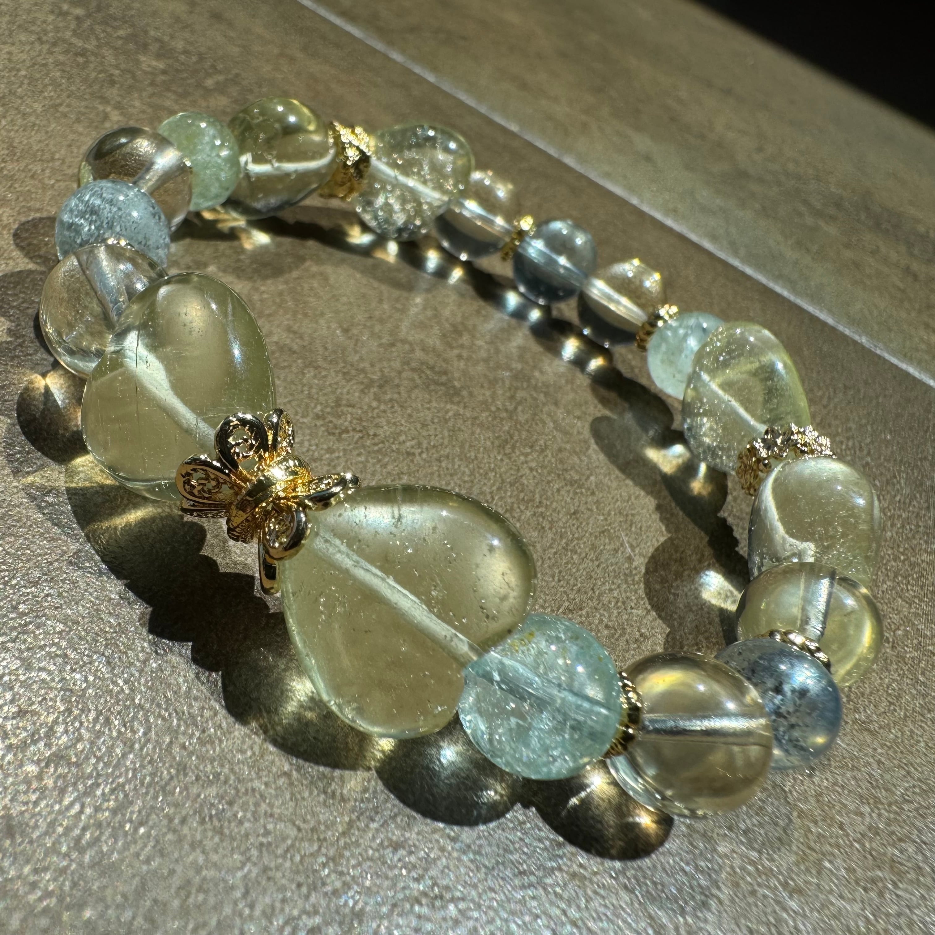 ちゅるんとリビアングラスハートに、シラーの美しいゴールデンアンデシンと、ブルーグリーントパーズがキラキラ、ピンクシラーやキラキラ、てりてりと個性溢れるモスアクアマリンが涼しいブレスです♡