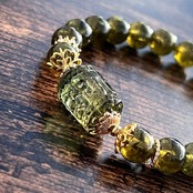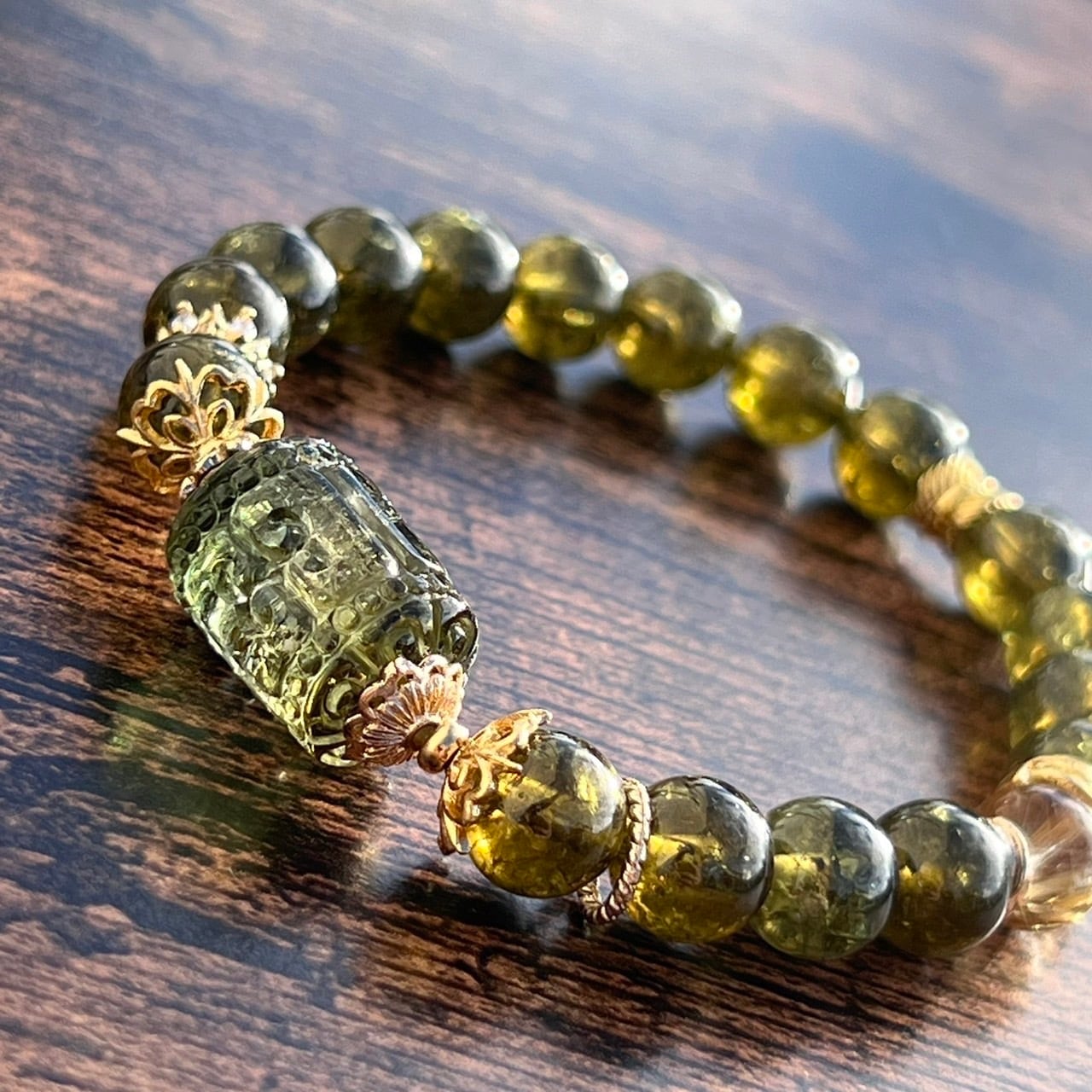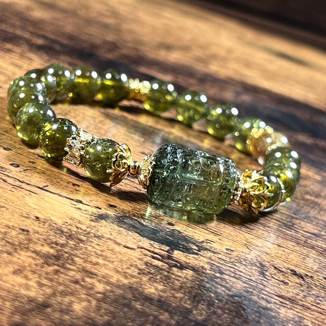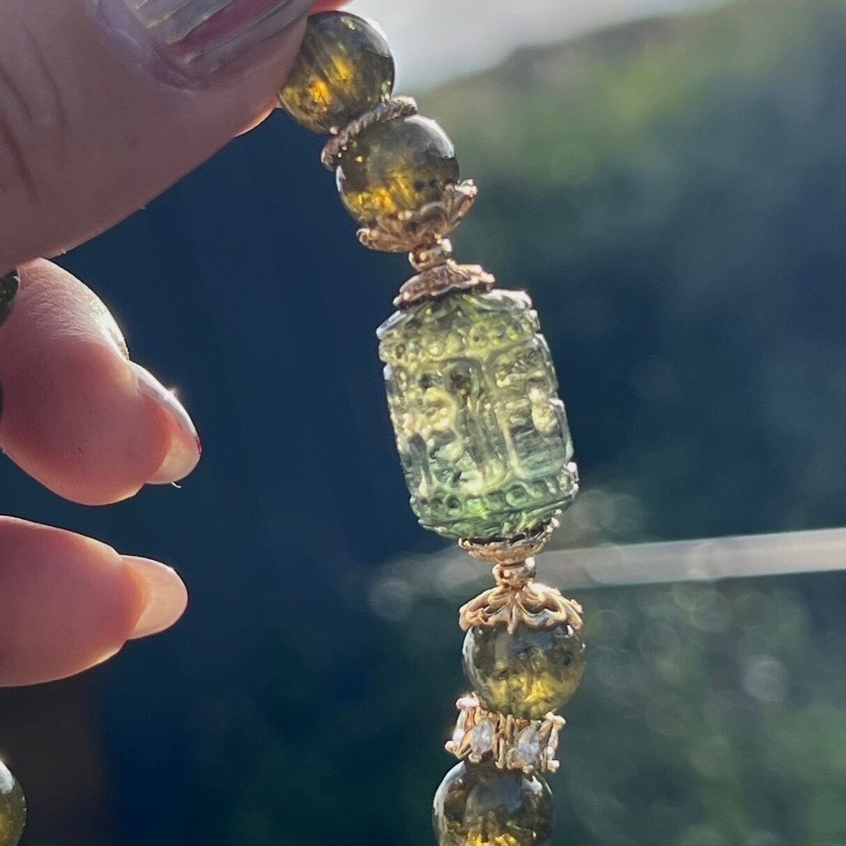 クリアでひんやりグラデーションなグリーントルマリンのマニ車とグリーンガーネット、ルチルクォーツのブレスです♡